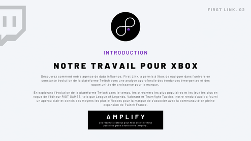 En qualité de Content and Social Media Manager chez First Link, placé sous la direction de Nicolas Bouchaib, Head of Innovation, j'ai dirigé la réalisation de nombreux rapports analytiques et d'influence. L'objectif était d'approfondir la compréhension de la plateforme Xbox France et de les accompagner dans leurs prises de décision stratégique, notamment en ce qui concerne la sélection d'influenceurs. En outre, j'ai assumé de consultant pour les campagnes de lancement de leurs jeux vidéo sur la plateforme tout au long de l'année 2022-2023.